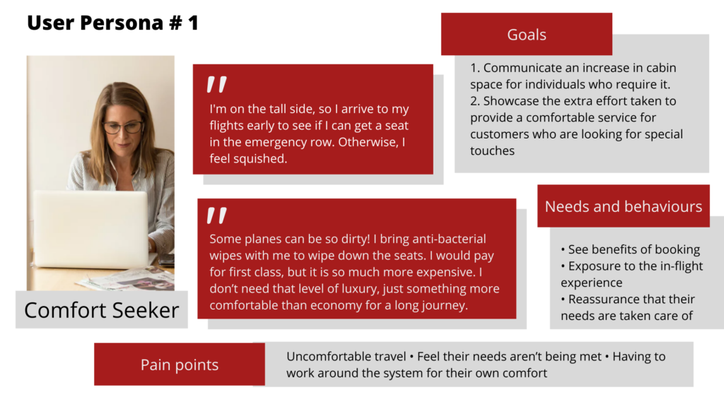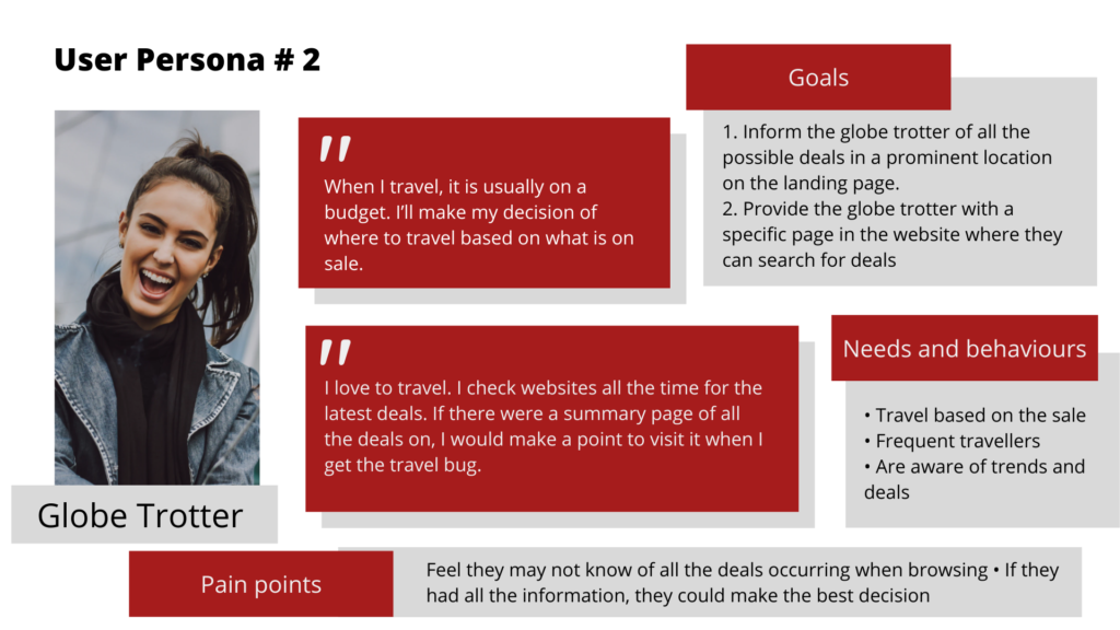 A user persona is a fictional representation of the ideal customers. As a UX designer, I started the design process by studying user research – building empathy with the target users and identifying what they need from the website. UX research helped me to create two user personas.