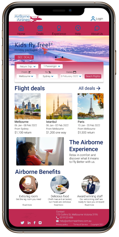 As ABA is new to the market, initially, they will release an MVP (minimum viable product) to the public. The requirement for an MVP at this stage is having a Home (landing page), Deals, Experience, Help and Search.